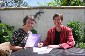 Liz Barber, GMPTE signs GMPTE agreement with Sarah Drake, first paid transport organiser.